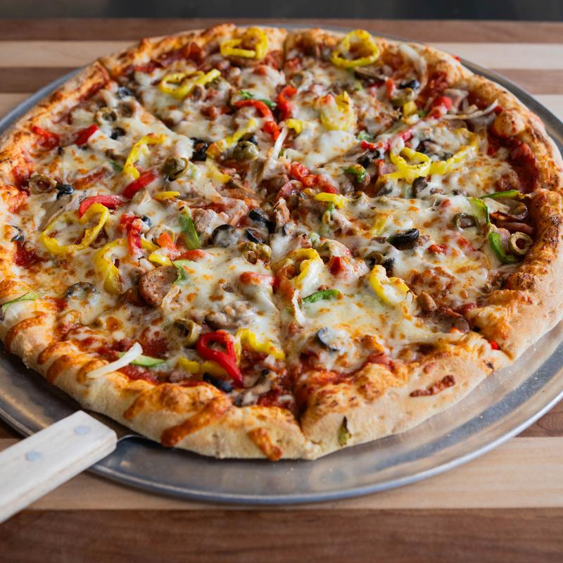 Traditional sauce, pepperoni, sausage, beef, ham, bacon, onions, green peppers, mushrooms, banana peppers, black olives, green olives & roasted red peppers • 7" Personal $9.49 | 12" $16.49 | 14" $18.49 | 16" $22.49